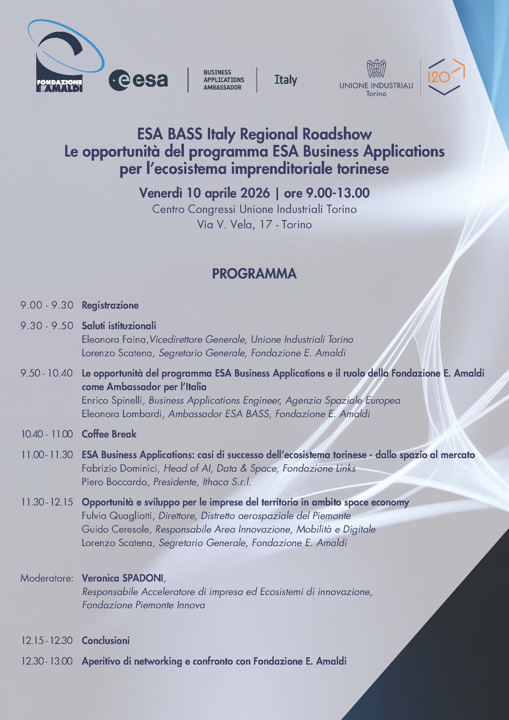 Venerdì 10 aprile 2026, dalle 9.00 alle 13.00, Unione Industriali Torino promuove e ospita la prima tappa 2026 dell’ESA BASS Italy Regional Roadshow, presso il Centro Congressi di Unione Industriali Torino.